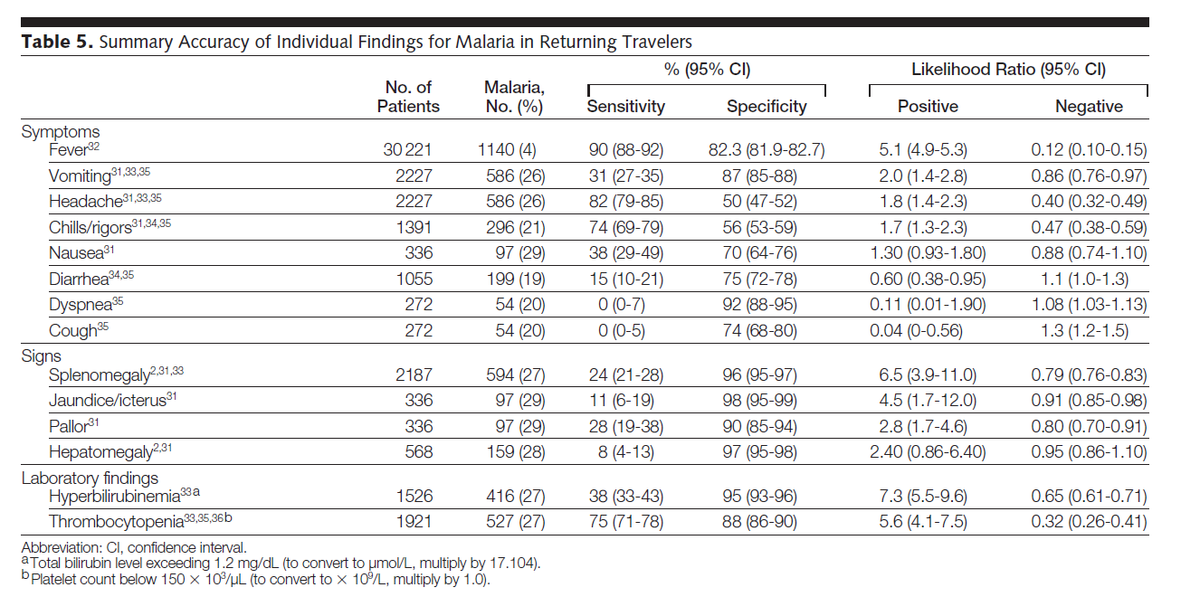 Le JAMA se rattrape avec un article intéressant sur le paludisme. On y retrouve les caractéristiques (sensibilité, spécificité, et rapports de vraisemblance (RV)) des principaux symptomes. Par exemple, la fièvre a un RV+ de 5,1 et négatif de 0,12: donc un patient consultant en retour de voyage sans fièvre a très peu de risque d'avoir un paludisme. La splénomégalie, est un signe peu fréquemment retrouvé, mais très spécifique, avec un RV+ de 6,5! Je vous laisse voir le tableau de résultats, même si en pratique, on a le frottis-goutte épaisse facile quand un patient qui revient de voyage se présente aux urgences...